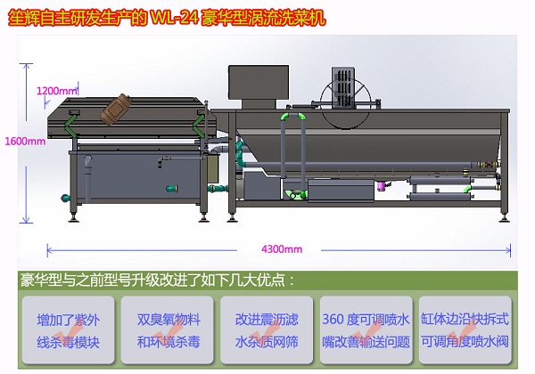 - 產(chǎn)品優(yōu)勢: 渦流洗菜機(jī)它適合葉菜類,根莖類和腌制蔬果清洗。如:白菜,生菜,菠菜,腌制過的蘿卜,大頭菜等。本廠生產(chǎn)的豪華型渦流式洗菜機(jī)整個清洗系統(tǒng)由清洗主缸體、震動輸送機(jī)兩大部分組成。 此豪華型洗菜機(jī)的特點(diǎn): 1.設(shè)備質(zhì)量可靠,用料考究,單位產(chǎn)量高。 2.自動化程度高,安裝操作簡單易懂。 3.功能設(shè)計(jì)合理,人性化布局,使保養(yǎng)清洗變得方便快。