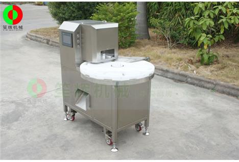 QYB-50保留原有鴨脖切段機(jī)的加工效率高、切面整齊、切割長短位置精準(zhǔn)一致等優(yōu)點的基礎(chǔ)上,結(jié)構(gòu)進(jìn)行了整體優(yōu)化,取代原有機(jī)械傳動更改為私服電機(jī)驅(qū)動,設(shè)備傳動更加簡潔,噪音更低,大大減少了設(shè)備使用過程中的維護(hù)工作,基本可實現(xiàn)零維護(hù)。放料盤與沖切部件相對運動采用電感式連鎖控制,PLC自動調(diào)整定位,傳動穩(wěn)定無誤差。觸摸控制屏可輕松設(shè)定切割速度及了解切割效率。該機(jī)器結(jié)構(gòu)緊湊,外形美觀,采用優(yōu)化衛(wèi)生設(shè)計,與食品接觸部件均采用符合食品安*全的材料制成。帶有萬向帶剎車腳輪方便移機(jī),能夠靈活調(diào)度提高生產(chǎn)效率;機(jī)器采用型腔式放料裝置,不損傷產(chǎn)品,針對彎曲形狀不規(guī)則的鴨脖或鳳爪等實現(xiàn)精準(zhǔn)切割;切割采用成型刀板切割,切割長度準(zhǔn)確,切面整齊,無粘連,不產(chǎn)生骨屑。刀板、轉(zhuǎn)盤、壓料板均可實現(xiàn)無工具拆卸設(shè)計,方便清洗殺菌更換,符合熟肉制品生產(chǎn)工藝。生產(chǎn)效率最高可達(dá)4800只/H,滿足廣大用戶的生產(chǎn)需要。